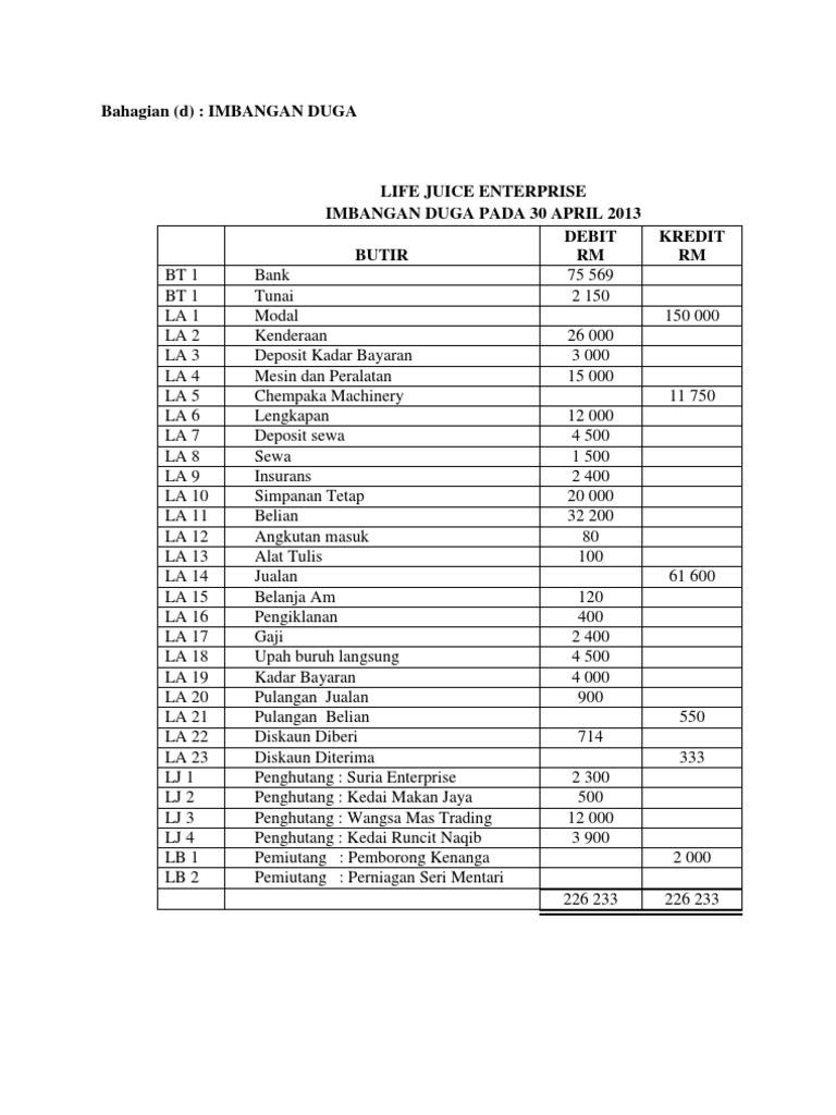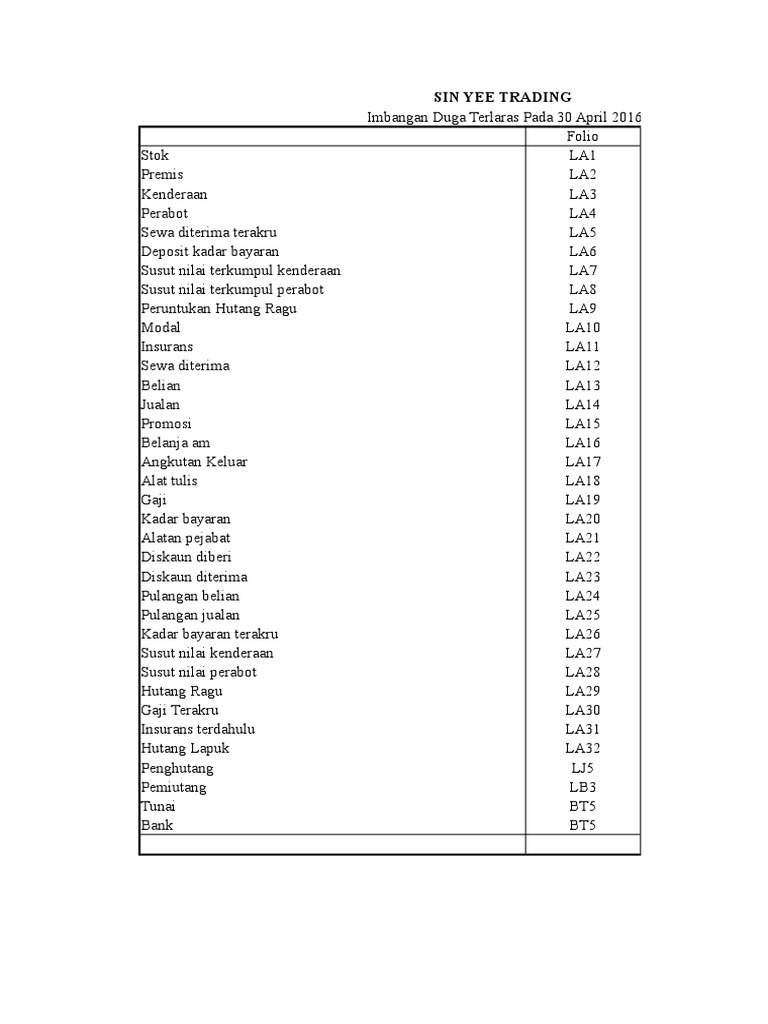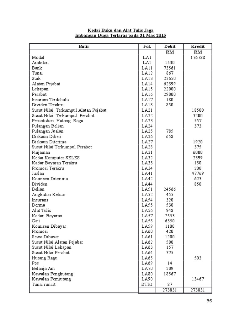 Akaun-akaun dalam lejar direkodkan berasaskan sistem catatan bergu. Imbangan duga merupakan pindahan baki Debit dan Kredit yang terkini dari Lejar. Trial balance and financial statements adjusted Last Update.