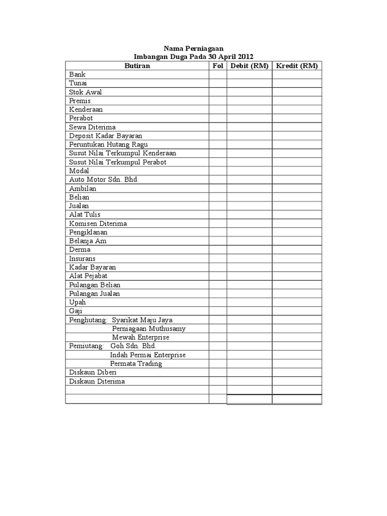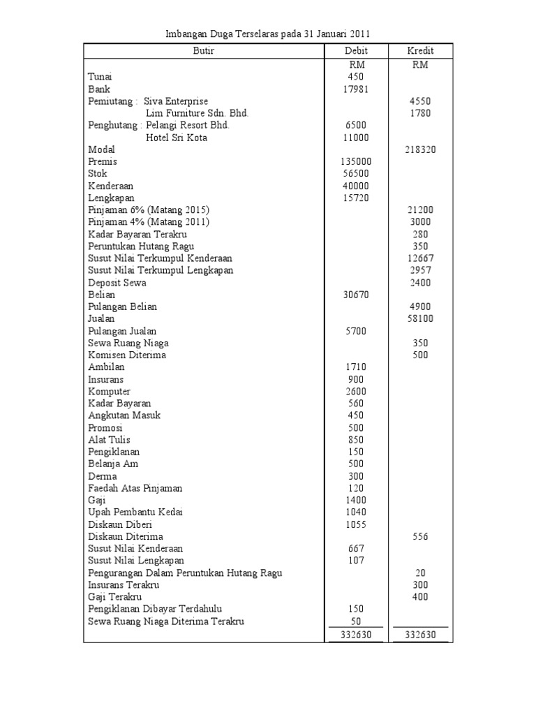 Pinjaman ditandatangani pada 1 Januari 2019 untuk tempoh sembilan bulan mempunyai nilai faedah 12 dan belum diambilkira dalam penyediaan imbangan duga di atas. Nilai imbangan debit akan disenaraikan dalam lajur debit baki percubaan dan baki nilai kredit akan disenaraikan dalam lajur kredit. Add to my workbooks 6 Download file pdf Embed in my website or blog Add to Google Classroom.